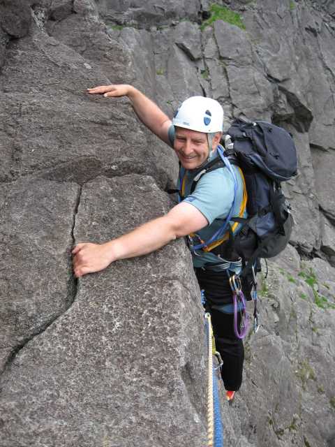 Peter finds the "thank God" hold on the crux traverse of Cioch West ...