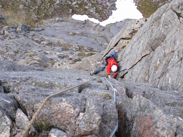 Rab climbing 'the Needle Crack' high up on the Shelterstone