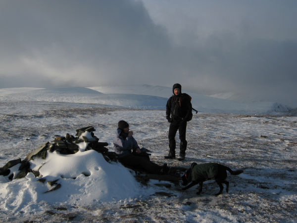 Rab, Lorna and Tara take in the views. The western Drumochter munroes in the background.