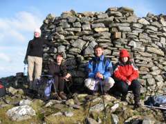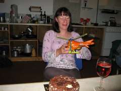| 22nd September 2006 - Strawberry Cottage, Glen Affric We all met up in the Slaters Arms in Cannich, and coordinated people & gear for the drive in. Once the torture of the track was over, we successfully arrived at the hut. We were treated to a very clear night, stars everywhere, you could even see the milky way. Colin reckoned he saw some shooting stars, could be the drink though. Hillwalking seems to be the order of the day just now, and so it was for this meet. Lots of Gaelic named hill were climbed, so apologies in advance for any mis-spellings. Rab & Mike headed south to A'Chralaig and Mullach Fraoch-coire. They saw a pair of Golden Eagles circling up then blasting off into the distance. Colin went west, to Sgurr nan Chrysanthemum, then Mullach nan Dheirgan. The rest went north, to Mam Sodhail, although by different routes for some reason. Lorna and Jacqui went up to the east of the hill, Monica, Claus and Ken to the west. They all met successfully at the top however. Of note, was that this was both Jacqui's & Claus' second Munro. Jacqui said "It's a bit bigger than Schiehallion". Quite ! Monica, Claus, Lorna & Ken continued to Carn Eighe. Everyone had brilliant views, stretching from Ben Nevis to Torridon, a great day to be out in the hills. Back at the hut, the chocolate cake & champagne just keeps on coming with the BFMC ! This meet coincided with Lorna's 40th birthday, which provided the excuse this time (if one was needed). She also enjoyed her present ... We had to look after Ben, a rather old collie who had randomly turned up at the hut. He had a good enough appetite, eating everything we could find, apart from Mike's rice. Better lay off the "secret ingredient" eh ? Ben's owners had in fact left a note for us, asking to phone them if he turned up. They'd become separated on the hill & hadn't been able to find him. He didn't seem to mind us all that much. Sunday was a miserable day. Even power-lounging couldn't keep us occupied, so we gave the hut a good clean and set off mid afternoon for the drive out the track, past the poor folks camping by the river. Mike was reunited with his front number plate, which had fallen off (un-noticed) on the drive in. More gear / people shuffling at the car park & it was off down the road. Ben was returned to his rightful owner at BP Connect, Perth (after scoffing down a sausage supper en route!) According to the owner, this isn’t the first time Ben has gone walkies, he has a history of disappearing in the hills. The best one being when he disappeared in Glen Nevis, only turning up 10 days later, after crossing the Mamores to Kinlochleven ! Perhaps someone should write a book about this dog and its obviously colourful life. How about an Honorary Braes o’ Fife Membership at least ! Monica, Lorna, Claus & Jacqui on Mam Sodhail Champagne, chocolate cake & a toy helicopter - who could ask for more !