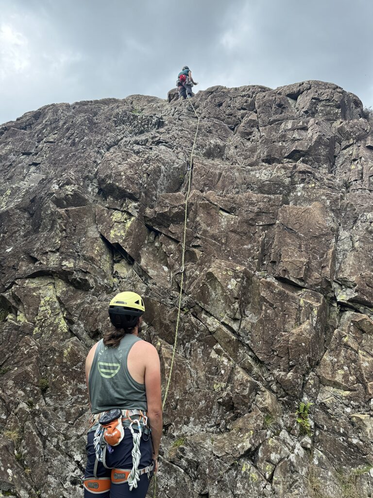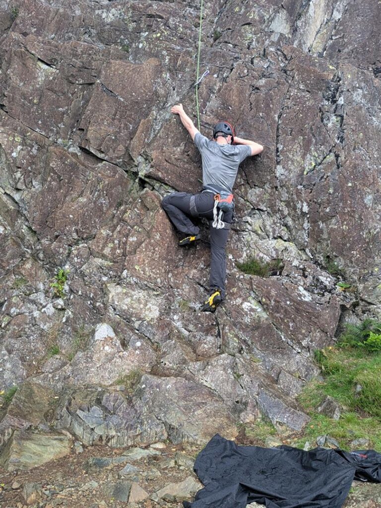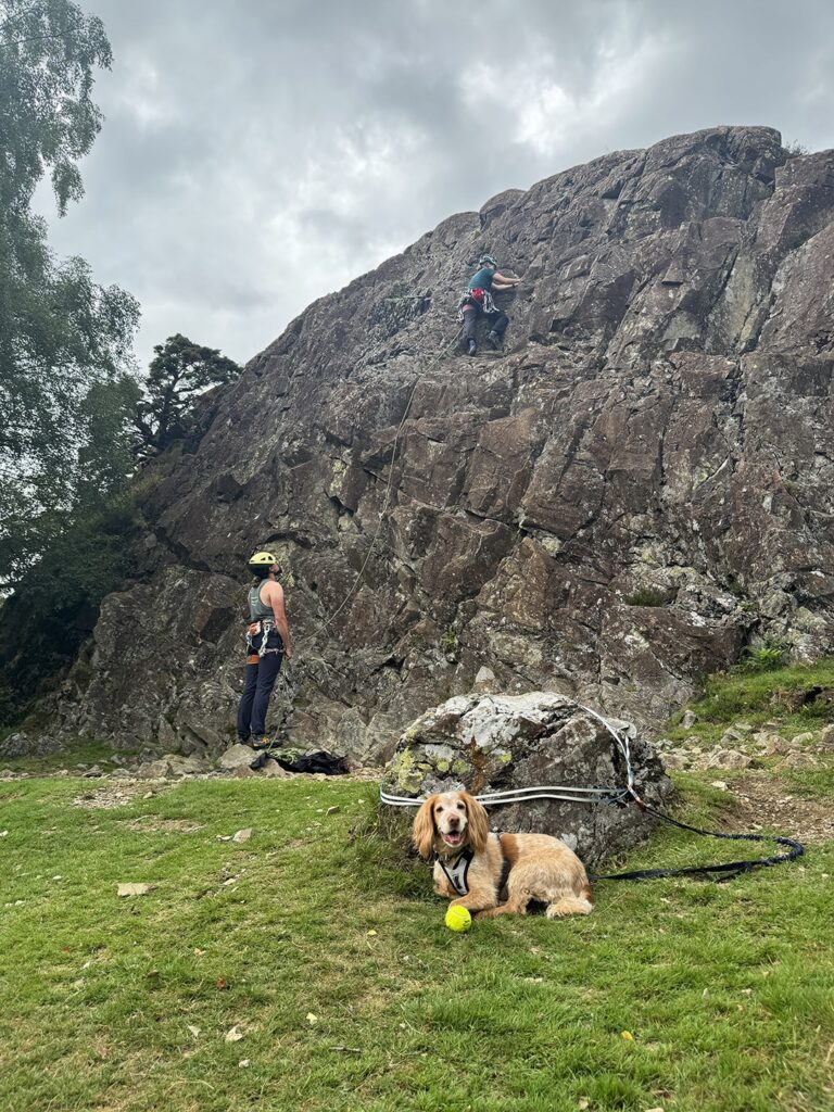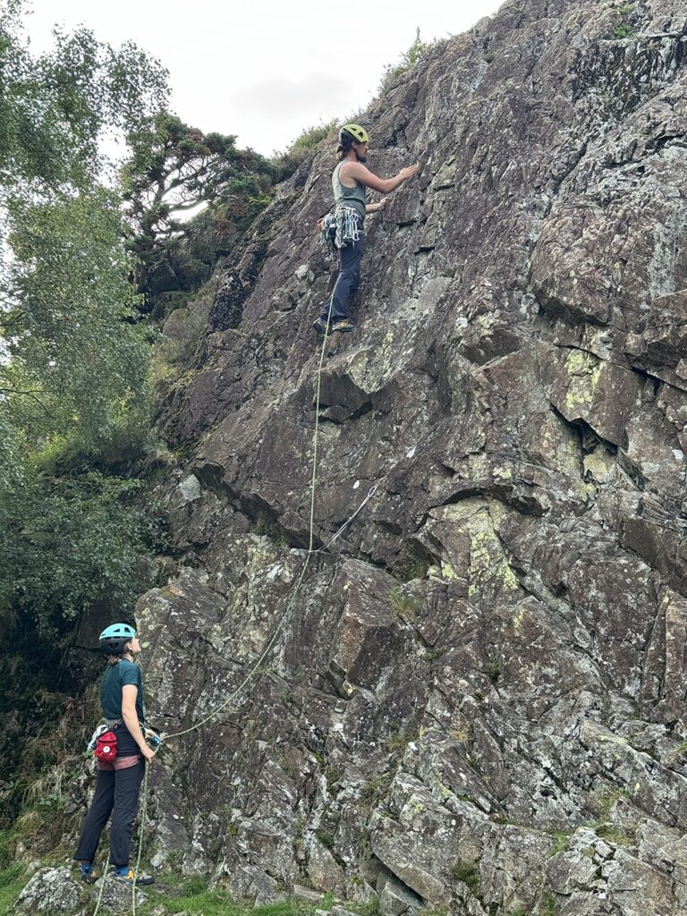 Later on, with the forecast promising a drier window, we made the most of it and headed to Upper Shepherd’s Crag for some climbing. The crag was ideal for a focused session dialling in trad gear placements and getting comfortable practising building anchors on a friendly 10m-ish lump of rock. While a ninja shower dampened climbing for a moment, a beautiful sunny spell carried us into the evening.
